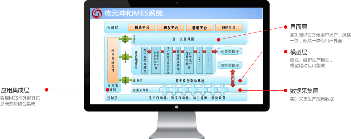 乾元坤和MES系统采用多层架构,利用面向对象技术进行设计和开发,应用中间件技术,以实现系统的