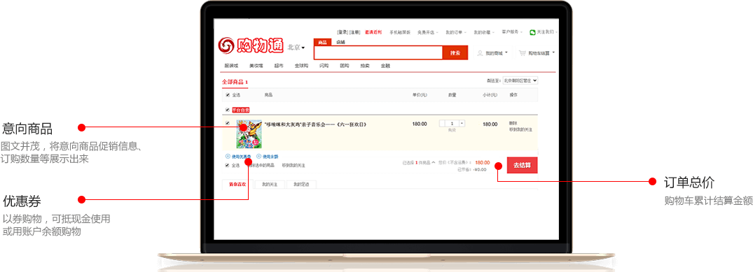 买家将意向商品放进购物车内,商品信息、优惠价格以及总计金额自动展示,并设自动结算功能。