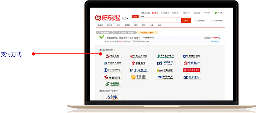 乾元坤和O2O模式网站平台支持多种付款方式:货到付款、支付宝、银行可在线支付等。